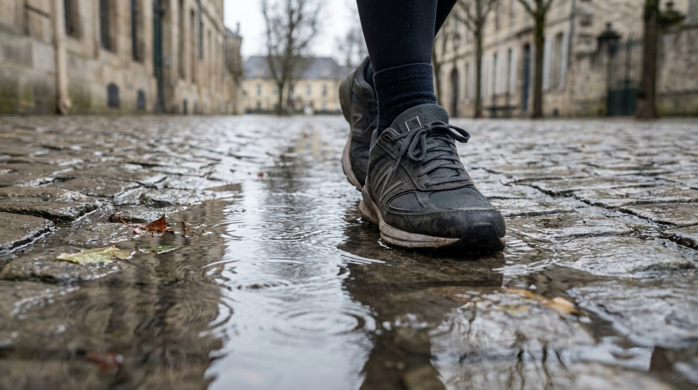 La scène classique se répète à chaque averse. On scrute le bitume. On évalue la profondeur du cratère urbain. On tente des acrobaties périlleuses pour épargner nos souliers chéris. Le premier test avec ces fameuses New Balance a bousculé mes réflexes. Face à une flaque redoutable, j'ai tout simplement posé le pied au centre. Une sensation étrange s'est alors installée. L'eau a enveloppé la chaussure sans jamais atteindre la chaussette. Un franc succès.